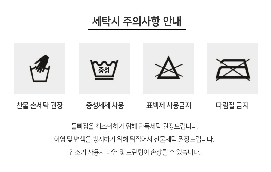 - 세탁시 색번짐이 물빠짐이 있을 수 있습니다. 가급적이면 찬물에 세탁해 주세요.